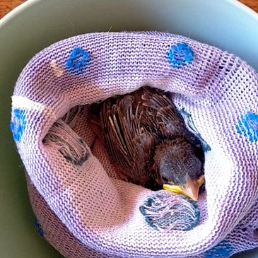 If you can't locate the nest keep the chick warm until you can get home. The chick will need something cosy to sit in, an old sock folded in on itself is perfect and line it with a little kitchen roll so that you can easily keep 'the nest' clean. A hot water bottle very well wrapped will serve to keep the chick warm but do keep checking it for the first ten minutes, only very gentle heat and as the bottle cools just unwrap a layer surrounding it.